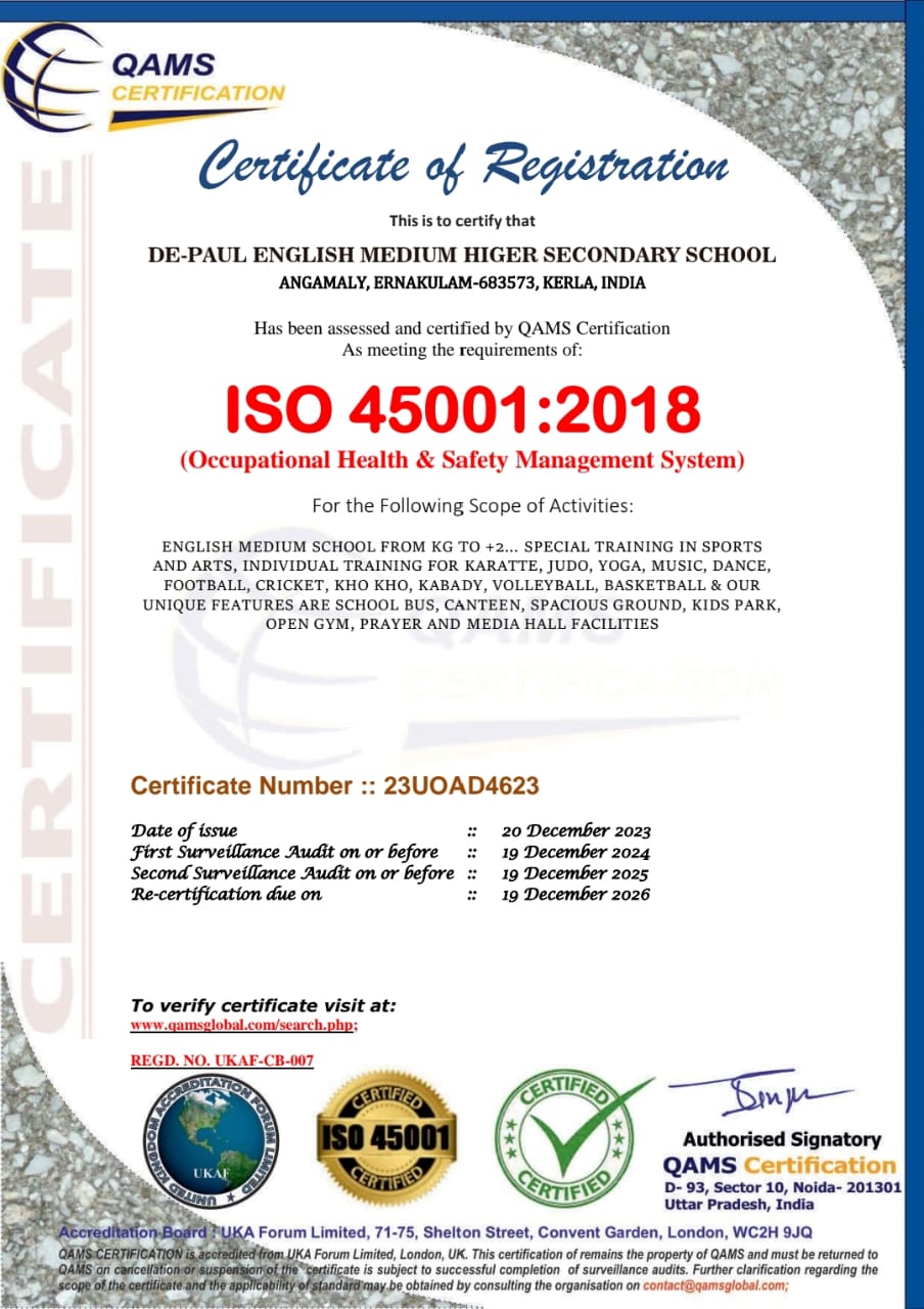De Paul EMHSS Angamaly is awarded with ISO 45001: 2018 Certification.